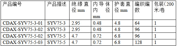 产品特性:成都安讯生产的SYV系列其依据GB/T14864-1993《实芯聚乙烯绝缘射频电缆》其性能满足上述行业标准要求。产品规格包括SYV75-(3、5、7)。导体和编织线全部采用纯铜线,频率范围:5MHz~1000Mz。